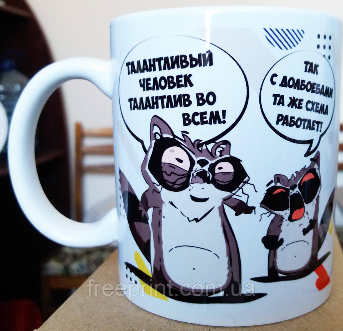 Чашка-прикол "Єнот Толик — таланти д@ лб@еби". Друк на чашках, гуртках. Нанесення логотипа на чашку