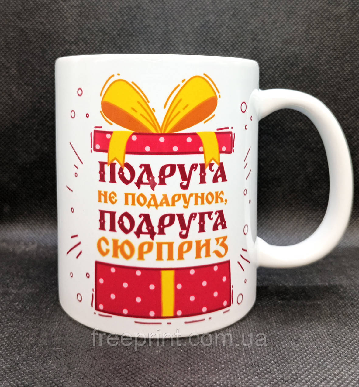 Чашка керамічна для чаю з оригінальним прикольним принтом "Подруга не подарунок, подруга сюрприз". Чашка для подруги.